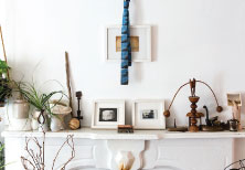 Other pieces interact with both levels of living, including tables with an upper plateau that moves to serve both levels and a lamp that reconfigures to serve as reading light, up-washer or standing lamp. There is also a screen that defines territory and doubles as a storage unit, the open-work parts of which serve to hang a mirror or digital devices.