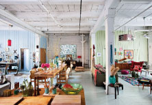 The interior includes brass-clothing racks, velvet mustard upholstery that glows against the shades of soft beige and ivory that surrounds it. Nearby sits a vintage Oscar Niemeyer chair placed askew to the retro inspired triptych mirror that steals the show!